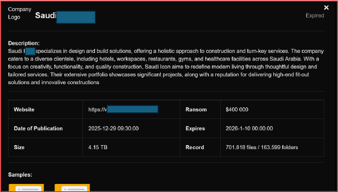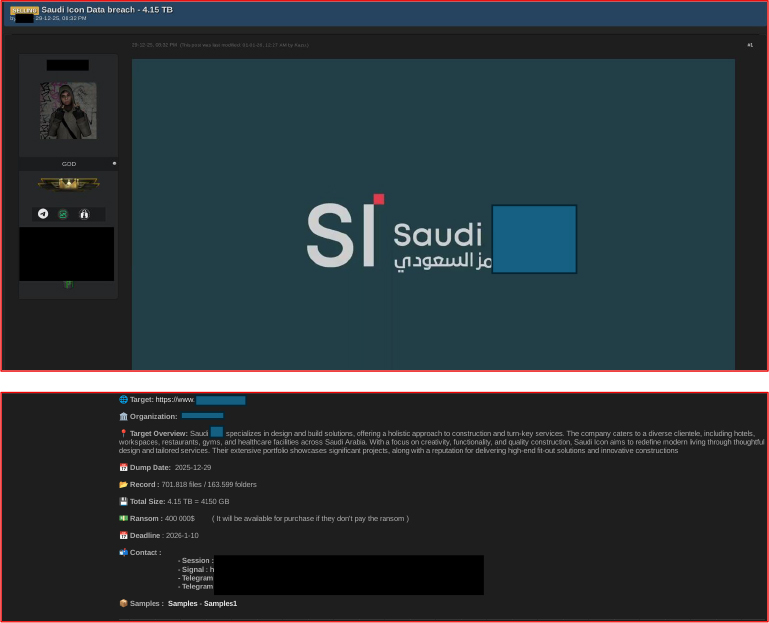 On December 29, 2025, an underground forum post claimed a large-scale breach of Saudi constructions, reporting the exfiltration of approximately 4.15 TB of data. The threat actor allegedly demanded a ransom of USD 400,000, warning that the stolen data would be sold or publicly released if payment was not made, and shared sample files as proof of compromise. The incident carries elevated strategic risk beyond commercial implications, as Saudi Icon operates across hospitality, retail, healthcare, and large-scale construction sectors that frequently intersect with government entities, regulated environments, and national development projects. Exfiltrated information may include architectural designs, project documentation, client contracts, supplier details, facility layouts, and access credentials, which could be leveraged for industrial espionage, supply-chain compromise, physical security breaches, or targeted attacks against critical facilities, particularly in healthcare and high-profile infrastructure.