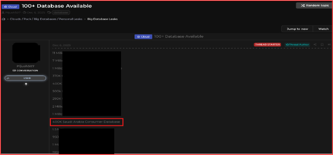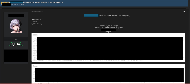 On December 6, 2025, an underground forum thread advertised access to several large-scale consumer and business datasets, including one described as containing hundreds of thousands of records related to Saudi Arabia. The listing was presented alongside other international data offerings, suggesting the potential commercial circulation of region-specific consumer information within cybercrime marketplaces. No technical validation or source attribution accompanied the post, leaving the authenticity and origin of the data unconfirmed. Nevertheless, the explicit marketing of a Saudi consumer dataset raises concerns regarding possible unauthorized aggregation or misuse of personal information. Even unverified listings can indicate demand-driven activity that fuels phishing campaigns, financial fraud, identity theft, and the resale of data to secondary actors.
