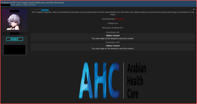 On January 16, 2026, a threat actor using the alias B4baYega claimed responsibility for a data breach affecting Arabian Health Care Supply (AHC), which operates across Saudi Arabia and the broader Middle East. The claim appeared on an underground forum from a newly registered member with minimal posting history. The actor alleged possession of the breached data in CSV format and offered database access via direct message, with download links conditioned on forum interaction. At the time of reporting, no independent verification had confirmed the authenticity, content, or scale of the dataset. Given AHC’s role in supplying hospitals and clinics, a confirmed compromise could expose sensitive business and healthcare-related information, potentially leading to regulatory implications, disruption of supply-chain operations, and secondary targeting of healthcare facilities or partners.