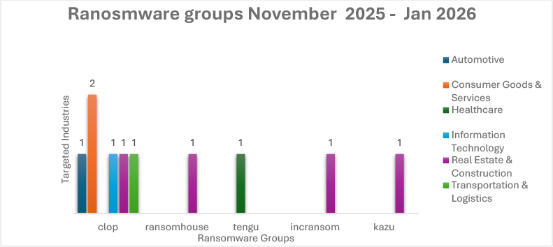 The below chart outlines sectoral targeting between November 2025 and January 2026, showing Clop conducting multi-industry operations across Automotive, Consumer Goods & Services (two incidents), Healthcare, Information Technology, Real Estate & Construction, and Transportation & Logistics demonstrating diversified victimology. RansomHouse, Incransom, and Kazu primarily targeted Real Estate & Construction, making it the most consistently impacted sector during the period. Tengu focused on Healthcare. Overall, the data reflects a mix of broad-spectrum targeting by high-capability actors and sector-specific operations by others, with Real Estate & Construction emerging as the most recurrently targeted industry.