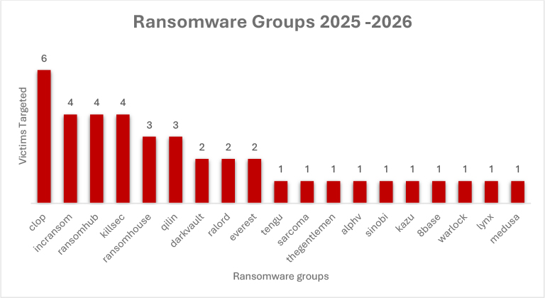 The below graph highlights ransomware activity across 2025–2026, showing Clop as the most active group with six victims, followed by Incransom, Ransom Hub, and Killsec with four each, indicating sustained campaign momentum. RansomHouse and Qilin recorded three victims, while DarkVault, Ralord, and Everest reported two each. The remaining groups were linked to single incidents. Overall, activity is concentrated among a few high-tempo operators, with multiple smaller actors conducting limited or opportunistic attacks.
