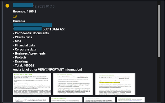 On December 29, 2025, at approximately 01:13, a Saudi Arabia organization was listed on a ransomware group’s data leak site. The threat actor claimed to have exfiltrated a significant volume of data, reportedly around 4,000 GB, and referenced the organization’s public website in the disclosure. According to the post, the compromised data allegedly includes confidential internal documents, client information, non-disclosure agreements, financial records, corporate and operational data, business contracts, and project-related materials such as designs and technical drawings. The listing also referenced the organization’s annual revenue and provided sample files as proof of the alleged breach. No independent technical validation or further forensic details were made available at the time of reporting.