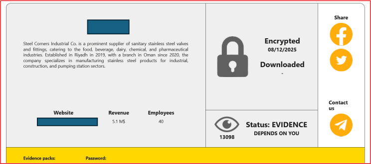 On December 19, 2025, an organization operating in the engineering and project development sector was listed on a ransomware group’s disclosure platform, with the encryption date reportedly recorded as December 8, 2025. The case was marked as “Evidence” and attributed to the respective threat actor. The listing claimed possession of internal company data, including confidential corporate materials and project-related documentation. Although no confirmed data volume was specified, an evidence package was reportedly made publicly accessible without password protection. The disclosure noted that prior attempts to contact the organization had not received a response at the time of publication. The post also referenced estimated company revenue and workforce size; however, no additional technical details or independent verification were provided.