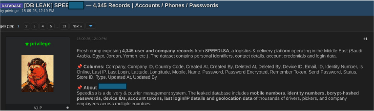 On September 15, 2025, a threat actor using the alias “privilege” advertised a database leak allegedly involving 4,345 user and corporate records from a Middle East–based logistics and delivery services platform operating in Saudi Arabia and neighbouring countries. According to the post, the dataset includes a range of account and operational metadata. While specific fields were listed by the actor, the exposed information reportedly consists of personal identifiers, contact details, device-related information, login activity records, and credential data (sensitive elements redacted). The listing suggests that both individual users and company-associated accounts may be affected. If authentic, such exposure poses risks including account takeover attempts, phishing campaigns, identity misuse, and potential targeting of operational staff. Given the platform’s role in logistics and courier management, compromised data could also introduce downstream risks to supply-chain operations and business partners. Independent verification of the dataset’s authenticity and scope would be required to assess material impact;