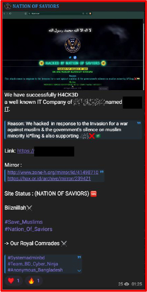 On November 22, 2025, a hacktivist group publicly claimed responsibility for compromising a regional IT services provider from Saudi Arabia , framing the alleged incident within a broader narrative of political and ideological grievance. The group referenced website disruptions and archived defacement records as proof of activity, using the announcement to project both capability and intent. While the technical validity of such claims remains unverified, the messaging itself is indicative of sustained interest in targeting digital infrastructure within the region. This pattern reflects a wider trend of ideologically motivated cyber activity aimed at organizations perceived as symbolically or strategically significant. Even when operational impact is limited, public claims of intrusion can heighten reputational exposure, invite copycat behavior, and amplify risk through coordinated social media campaigns or harassment efforts.