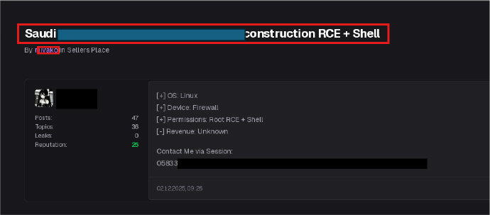 On December 2, 2025, an online forum post by a pseudonymous user advertised alleged privileged remote access to a network security device associated with a government-linked development entity. The listing claimed high-level system control over a Linux-based firewall, though it did not include technical proof, evidence of exploitation, or clear indications of monetization. The limited transparency surrounding the post leaves the claim unverified, but not without potential significance. If such access were genuine, it could expose sensitive systems to risks including unauthorized data access, operational disruption, and broader network compromise. Security infrastructure devices, particularly those positioned at the perimeter of critical environments, represent high-value targets due to their role in controlling and monitoring network traffic. Even unconfirmed claims of this nature warrant timely validation and technical assessment, as proactive investigation is essential to mitigating potential vulnerabilities and safeguarding institutional resilience, especially where public-sector systems and nationally significant functions may be involved.