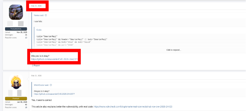 Threat intelligence monitoring indicates that vulnerabilities affecting enterprise communication platforms often attract attention within underground security communities. Discussions referencing SmarterMail vulnerabilities have appeared in security forums and messaging channels, where participants exchange exploit techniques and research findings.