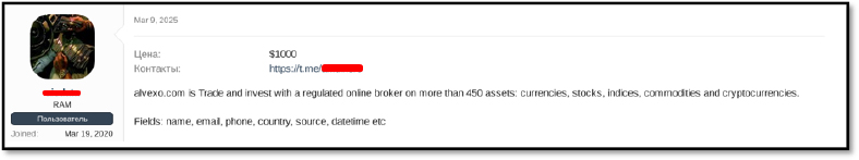 On March 9, 2025, a user on a Russian forum advertised a dataset of trading leads for sale, priced at $1,000. The seller claimed that the data originated from alvexo.com, a regulated online broker, though this claim remains unverified. According to the listing, the dataset includes information, such as name, email, phone number, country, source, and datetime, with entries from multiple countries. Notably, it mentions 166 leads specifically from Nigeria.