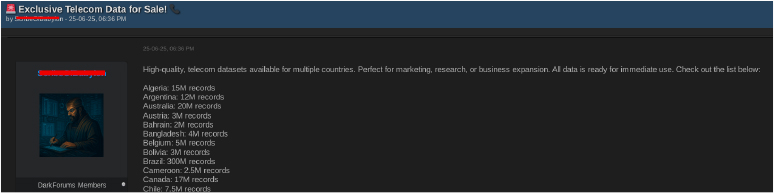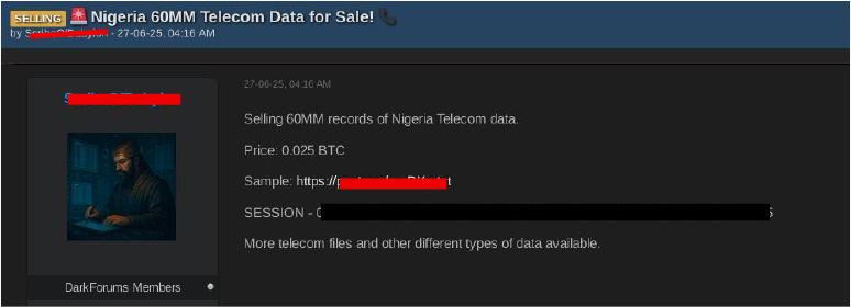 On June 25, a dark web forum user known as “ScribeOfBabylon” posted an advertisement titled “Exclusive Telecom Data for Sale!”, claiming to offer high-quality telecom datasets from multiple countries. The listing specifically mentioned approximately 60 million records from Nigeria.