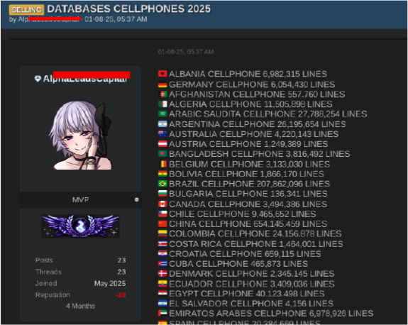 On August 1, a dark web forum user operating under the alias “AlphaLeadsCapital” advertised cellphone databases for 2025 from multiple countries, specifically claiming to offer 8,012,658 records from Nigeria, among other datasets.