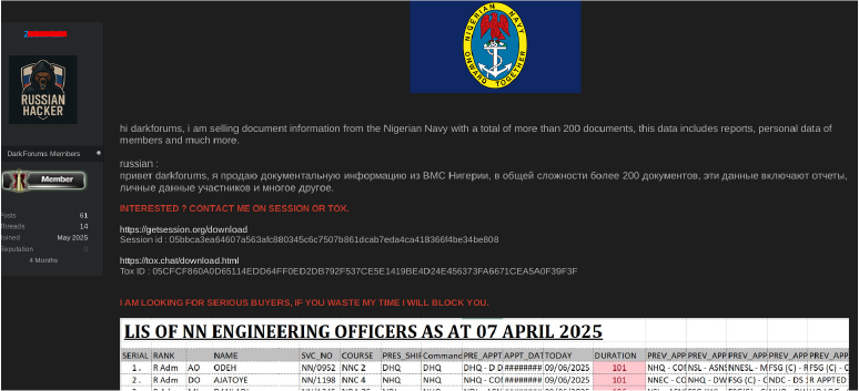 On June 9, a dark web forum user identifying as “Zabaniah”, claiming to be a Russian hacker, advertised the sale of data allegedly belonging to the Nigerian Navy, consisting of more than 200 documents. The materials reportedly include internal reports, personal data of members, and other sensitive information. The actor also shared sample images, including a list of Nigerian Navy engineering officers dated April 7, 2025.