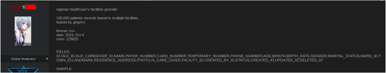 On October 9, 2025, a dark web forum user identified as “Tanaka” posted a dataset allegedly sourced from a Nigerian healthcare facilities provider. The dataset, reportedly containing approximately 130,000 patient records across multiple facilities, was shared in CSV format and dated October 6, 2024, with a total of 129,825 rows. The leaked data purportedly includes sensitive information such as patient names, payer and card numbers, phone numbers, ages, birth dates, genders, marital statuses, residence details, facility IDs, and timestamps, among other fields.