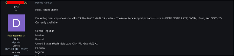 On April 14th, a dark web forum user known as “GermanyYou” advertised access to MikroTik RouterOS systems offering VPN and SOCKS5 services in countries including Nigeria. The price was listed at $75–$100. The post also mentioned providing tips to keep routers accessible longer