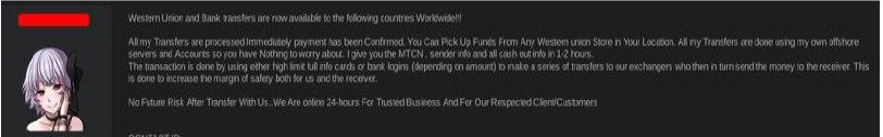 On May 13, a dark web forum user operating under the alias “SimonCheshire” advertised international Western Union and bank transfer services, including offerings for Nigeria. The seller claimed that transfers were processed immediately via offshore servers, with MTCN codes or bank details delivered within hours — though this claim remains unverified.