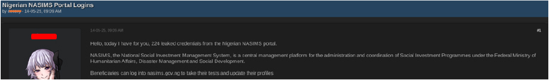 On May 14, a dark web forum user going by the name “desoxy” posted a batch of 224 leaked credentials allegedly sourced from the Nigerian NASIMS portal. NASIMS, the National Social Investment Management System, is the central platform used to manage and coordinate social investment programs under Nigeria’s Federal Ministry of Humanitarian Affairs, Disaster Management, and Social Development.