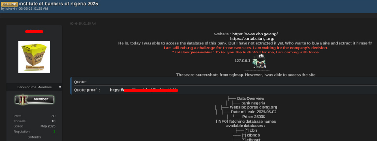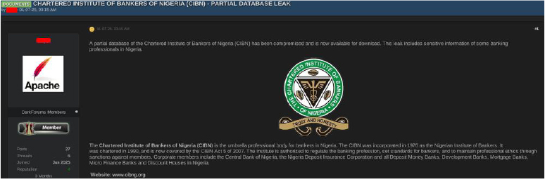 On July 1, a dark web forum user using the alias “httpd” posted a partial database leak allegedly linked to the Chartered Institute of Bankers of Nigeria (CIBN). CIBN is the umbrella professional body representing bankers across Nigeria.