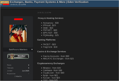 On June 14, a dark web user operating under the alias “Eden88” advertised access to a wide range of compromised accounts spanning exchanges, banks, payment systems, proxy/hosting services, gaming platforms, and other digital services. According to the post, proxy/hosting and gaming accounts were priced between $20–$30, while casino, AML, and KYC-verified exchange accounts started from $25. Cryptocurrency exchange accounts — including those from Binance, Coinbase, KuCoin, and OKX were listed for $20–$40, and banking/payment service accounts, such as Wise, Revolut, Skrill, and Payoneer, ranged from $25 to $350.