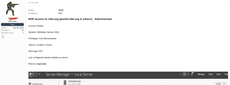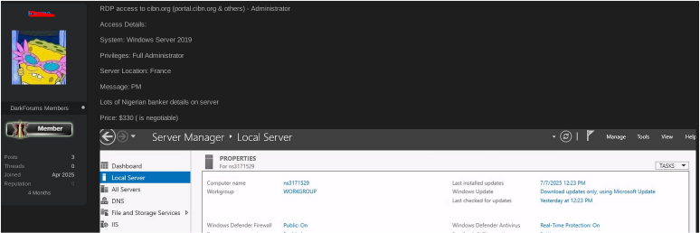 On July 15, a dark web forum user operating under the alias “Karma” advertised Remote Desktop Protocol (RDP) access to the domain cibn.org, including subdomains such as portal.cibn.org and other associated hosts. The seller claimed to have full Administrator privileges on a Windows Server 2019 instance reportedly located in France.