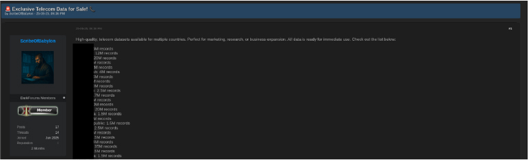 In June 2025, a dark web actor using the alias “ScribeOfBabylon” posted an advertisement on a cybercriminal forum offering large volumes of telecom data for sale. The post listed datasets from multiple countries, with claimed records ranging from the hundreds of thousands to hundreds of millions. Notably, Oman was explicitly mentioned with 5 million records available, suggesting that subscriber data from the country may be part of these illicit datasets. This activity poses potential risks, including identity theft, targeted phishing, and fraud across the affected regions.