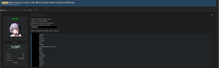 Another forum user operating under the alias “hulky” advertised a “Mix Countries Crypto Leak” in August 2025 containing around 6.3 million records, with data fields including names, emails, phone numbers, and countries; the post listed several regions, notably Oman with 4,821 records, alongside others, and sample data shared included real PII, such as full names, email addresses, and phone numbers, suggesting credibility. This activity highlights the continued targeting of individuals in the region through large-scale data leaks, which may enable cybercriminals to profile victims and link identities across multiple platforms.