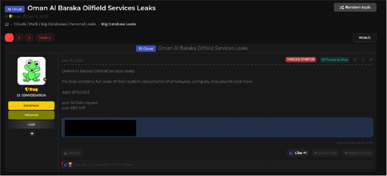 A dark forum user identified as “frog” published a thread claiming to have leaked data from Oman-based Al Baraka Oilfield Services. The leak in September 2023 was shared as a compressed archive of approximately 500–680 MB and reportedly contains the full source code of the company’s systems, employee records, and corporate documents. The exposure of both operational and personnel-related information suggests a potentially significant compromise, raising risks of corporate espionage, disruption of business operations, and the targeting of employees through social engineering or credential abuse.