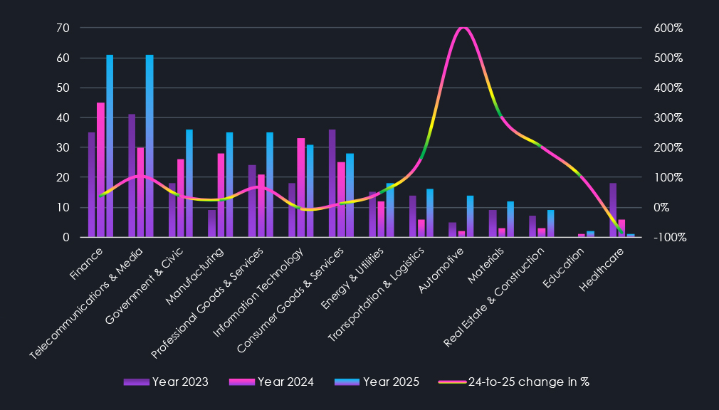 The case of the automotive industry is interesting as it has declined significantly in the previous year, with only a few traditional automotive companies targeted; however, 2025 saw a resurgence, specifically targeting EVs and related technology.