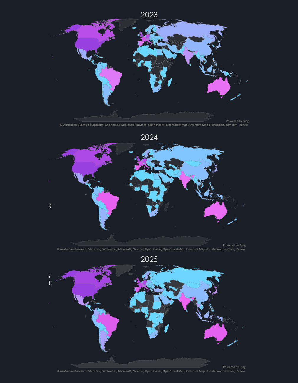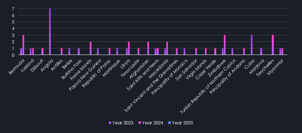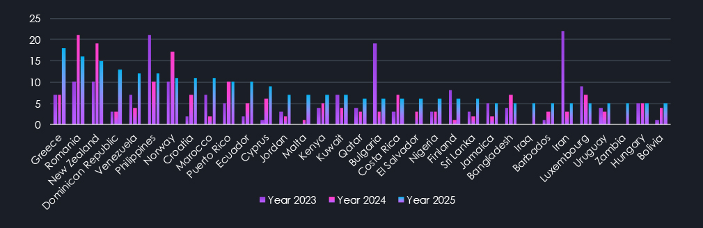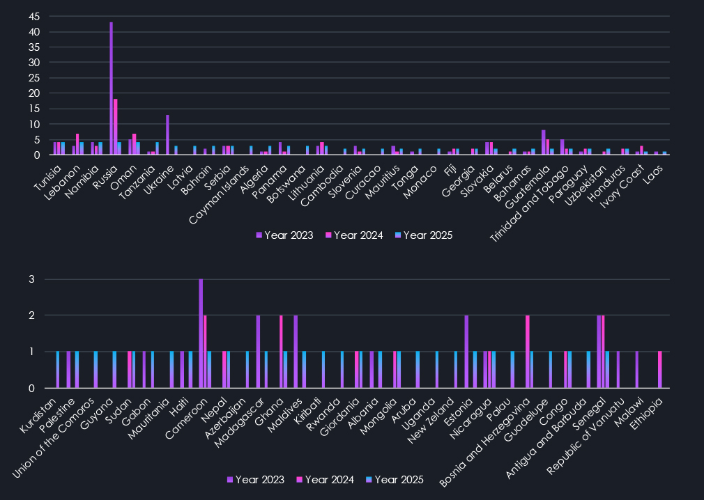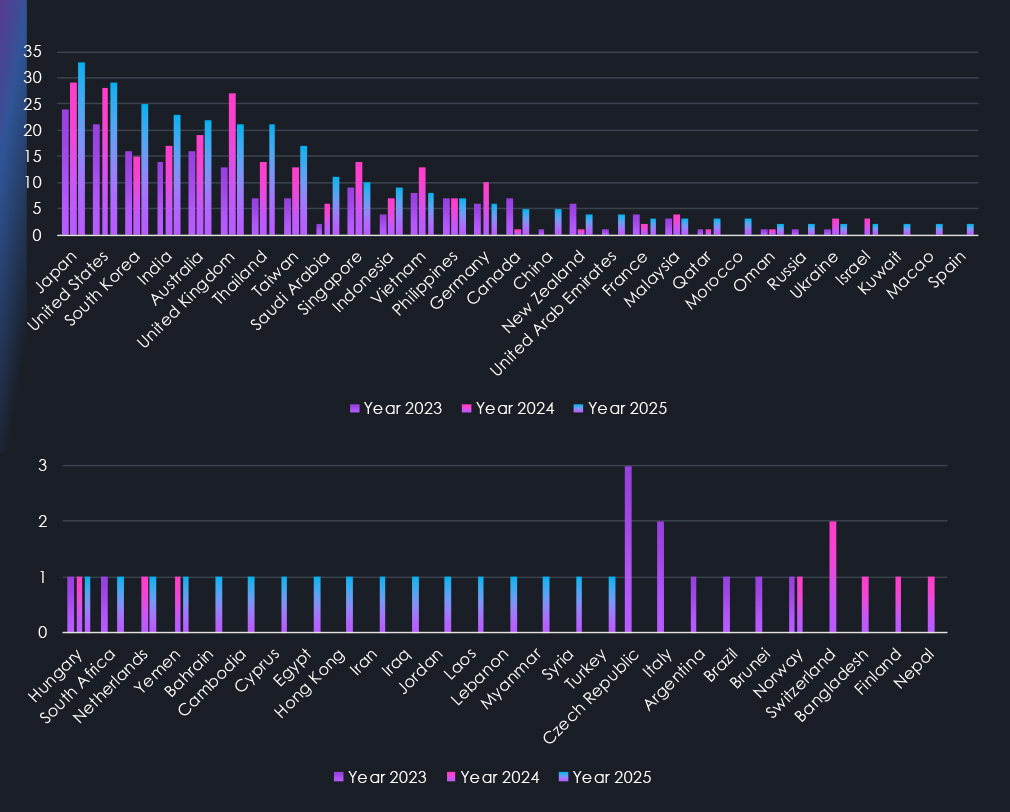 Data on the geographical distribution of attacks reveals an evolving global threat landscape. The number of affected countries increased from 30 in 2024 to 46 in 2025. As the number of countries affected grew, so did the distribution and intensity of the incidents.