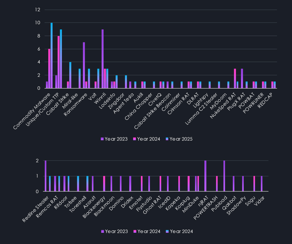 Malware and tactics, techniques, and procedures (TTPs) observed in recorded campaigns mostly follow the trend of the previous year. Specifically, there’s a growing use of commodity malware, but also an increase in custom and unique TTPs. Despite sounding contradictory, this combination makes a lot of sense in context. It follows how these tools are being used and how they’ve evolved.