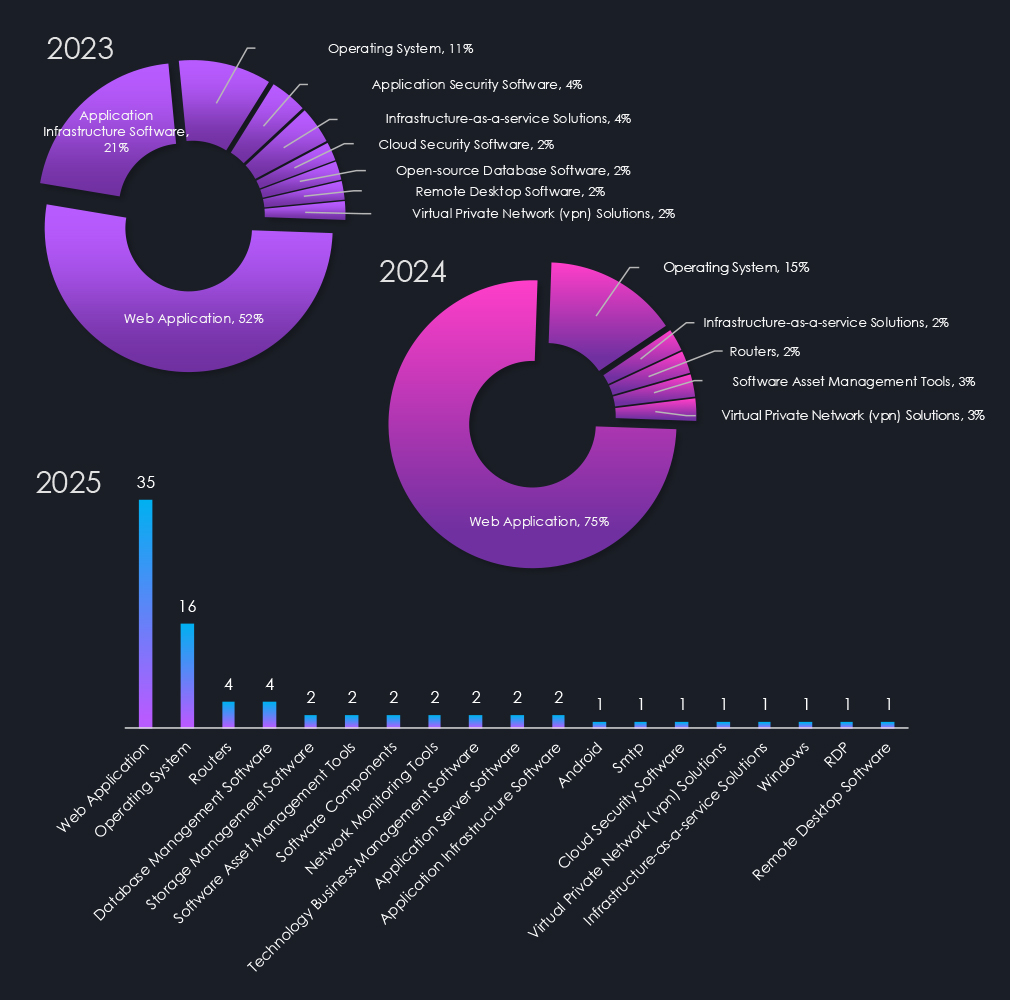However, in 2025, we have seen an even more diverse range of technologies being targeted than in 2023. While Web Applications and Operating systems remain the most frequent targets, as Web Apps are by their very nature internet-facing and operating systems are omnipresent on devices. A wide range of management, network, and application software has become increasingly more targeted.