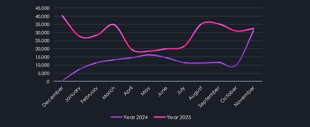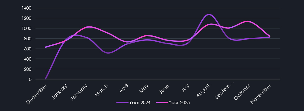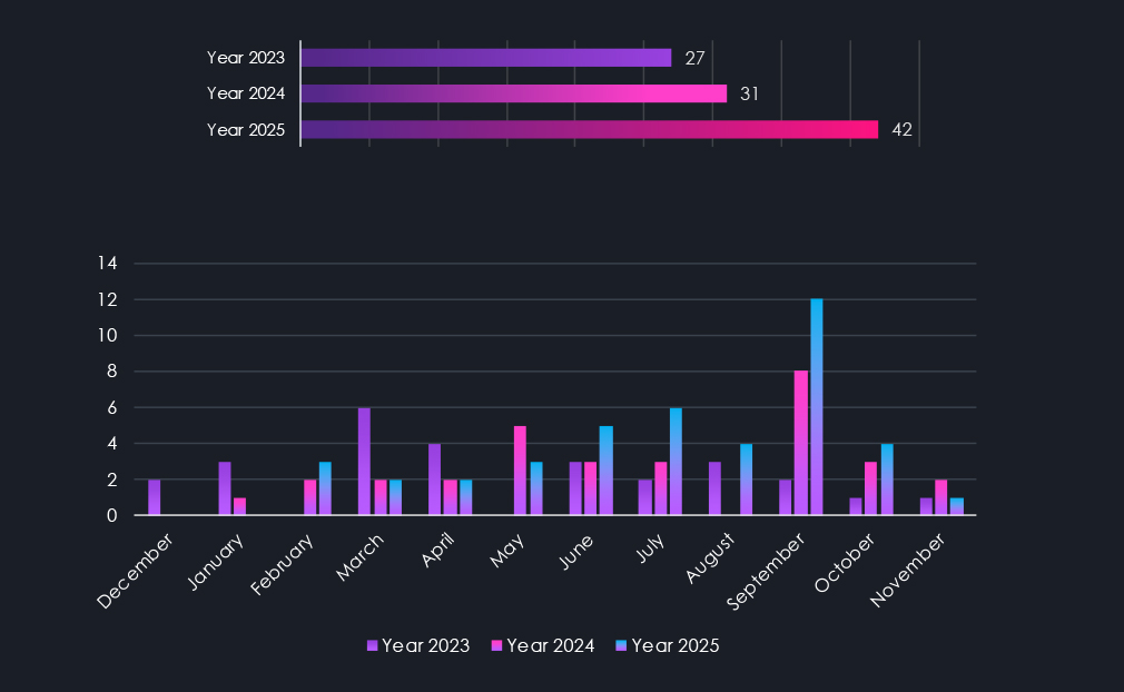 APT activity tracked by the DeCYFIR platform continued its upward trajectory in 2025, reaching 42 recorded campaigns. This reflects 35.5 % year-over-year growth and a 55.6% increase compared to 2023, confirming sustained expansion rather than episodic spikes. While collection bias affects monthly visibility, multi-year patterns remain consistent, with reduced activity typically observed from November through January and increased tempo across spring, summer, and autumn.