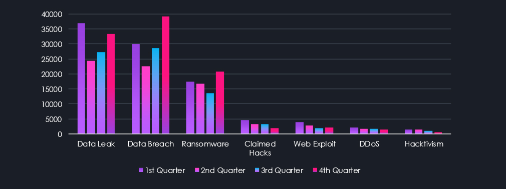 For a cleaner visual interpretation and focused specifically on the year 2025, the chart below shows the quarterly distribution of categories. Top 3 categories of Data Leaks and Breaches with Ransomware chatter are on an upward trajectory into 2026.