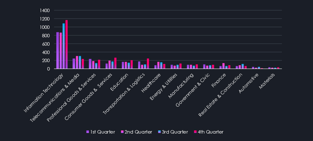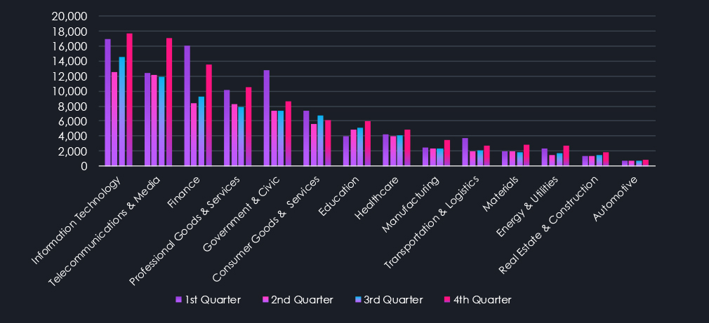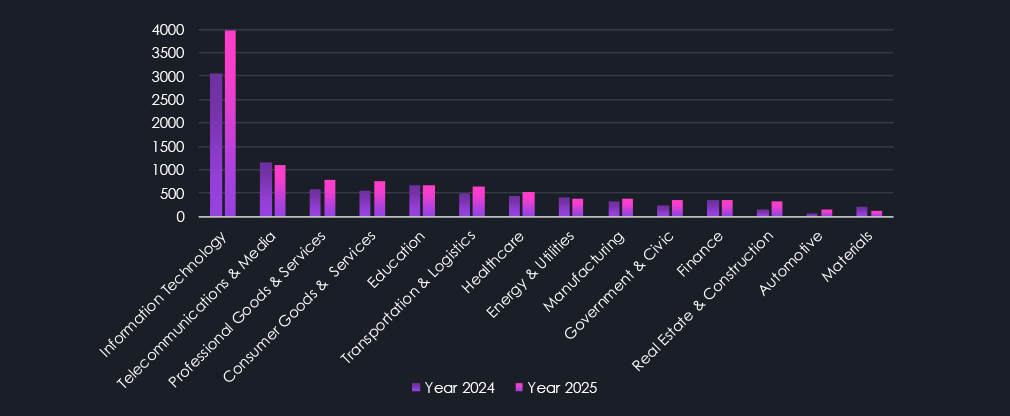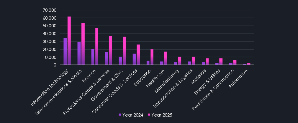 In 2023, the most targeted industries were Telecommunications & Media, Consumer Goods & Services, and Finance. By 2024, the threat landscape shifted. Finance, Information Technology, and Manufacturing became the top three most targeted industries.