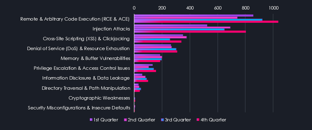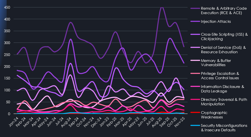 Injection Attacks are the second most frequent category and showed the highest increase year-over-year. Another notable category is Memory & Buffer vulnerabilities, also showing a significant jump during 2025.