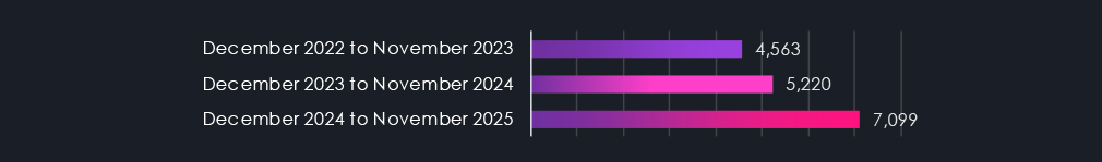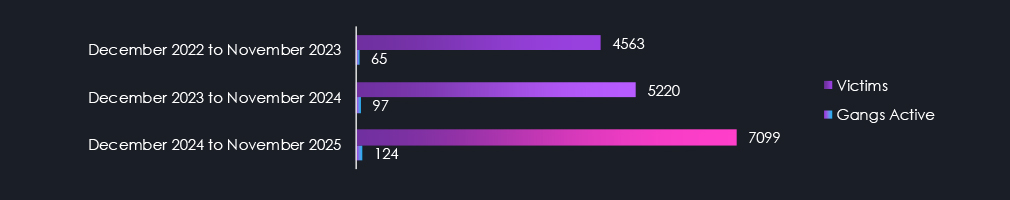 In 2023, CYFIRMA recorded 4,679 verified ransomware victims, while in 2024, the number increased to 5,219, representing a 11.5% year-over-year growth across all industries. 2025 showed even further growth to a new all-time high of 7,099 victims and 36% year-over-year jump.
