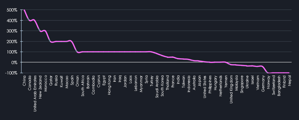 Though less prominent due to scale, the growth in Asian countries, notable in previous charts, is also visible.