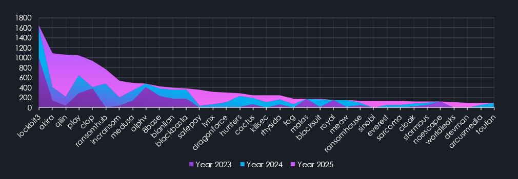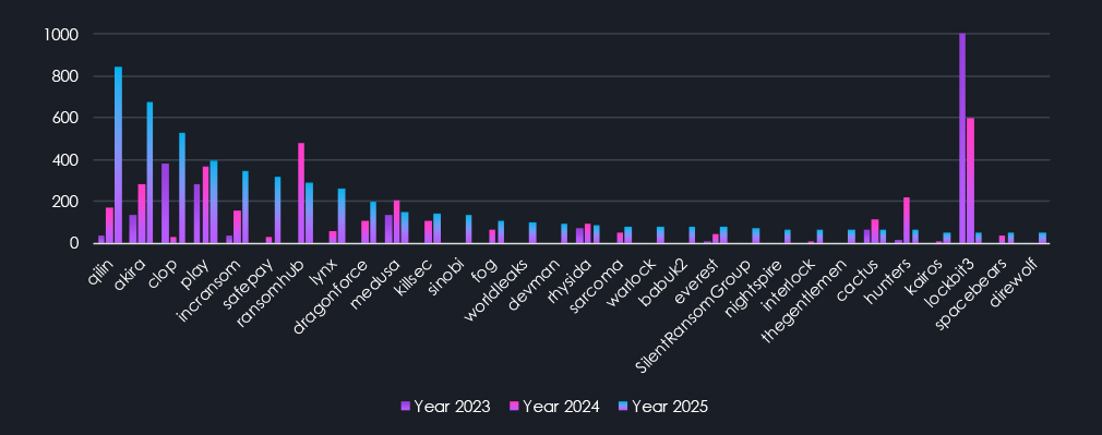 On the last chart above, we can see se which of the top 35 gangs contributed to the victim counts the most, sorted by total count of victims over all three years. 2023 and 2024 clearly show the LockBit3 domination, its fall, and shift towards Akira and ultimately Qilin taking over as the most dominant gang of 2025. Furthermore, emerging groups like Safepay and Lynx, and older groups like IncRansom, gained success, contributing to the new all-time high.