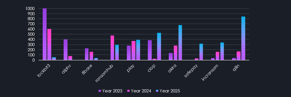 This is similar logic, showing RaaS per share of all victims in the given year. Interestingly, even though Qilin has recorded numbers close to LockBit3 in 2023 (846 and 1003, respectively), it does not come close to LockBit’s overall share. The domination of LockBit3 in 2023 was staggering, with 21.98% of all victims for the year. Qilin’s 11.92% in 2025 is nearly equal to LockBit3 in 2024, with 11.48%, despite LockBit3 having only 70% of the total number of Qilin’s 846 victims.