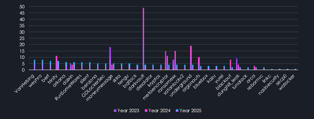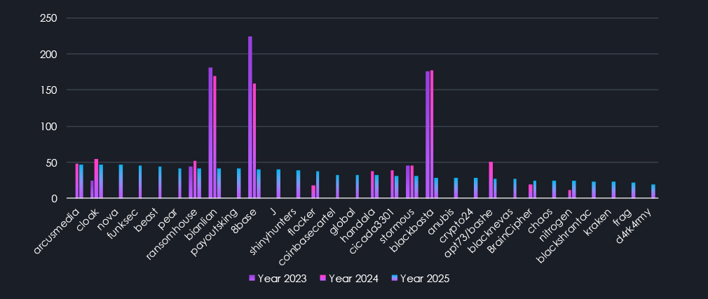 As discussed, the number of ransomware gangs grew from 65 in 2023 to 124 in 2025. However, that does not mean all the gangs from 2023 are still active. The endless cat and mouse game with law enforcement forces gangs to break up, regroup, and rebrand constantly.