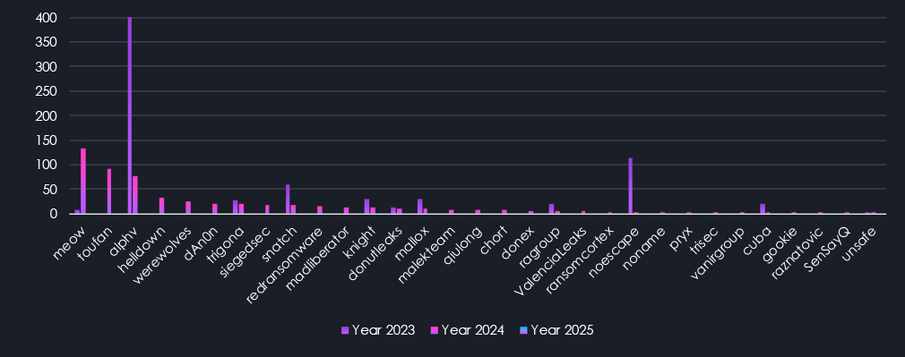 The chart above is now sorted by victims in 2024, as we ran out of gangs active in 2025. Here, the most prominent is the decline of ALPHV, the former top-ranking gang. In total, 37 gangs from 2024 did not survive into 2025.