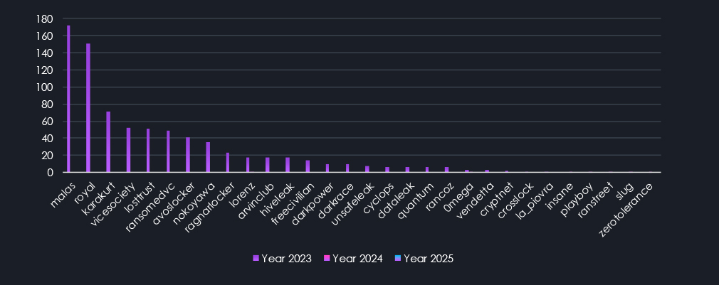 The following chart displays the top 30 ransomware gangs sorted by the number of victims during 2025. Comparison to previous years clearly shows how the names change over time. Many gangs appeared or gained success only during 2025, while others showed sustained activity across years or diminished over time.