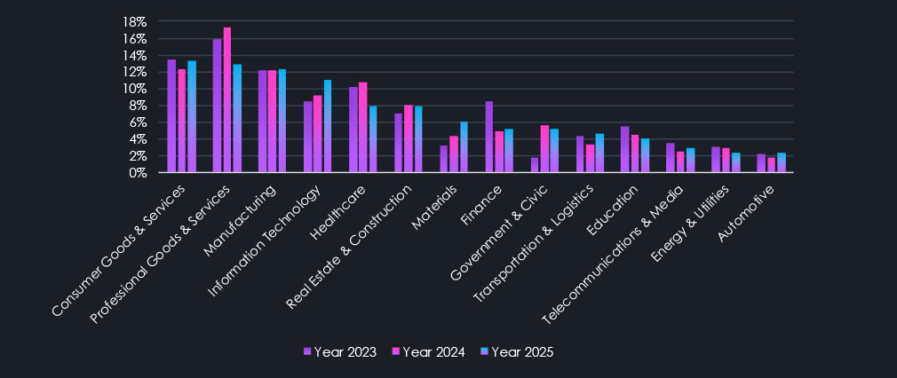Industry targeting in 2025 expanded across the board. Consumer Goods & Services, Information Technology, and Materials saw the largest growth, with proportional analysis highlighting a shift toward IT providers and interconnected environments. Manufacturing maintained a stable share, while Healthcare and Professional Goods & Services showed relative deprioritization rather than decline.