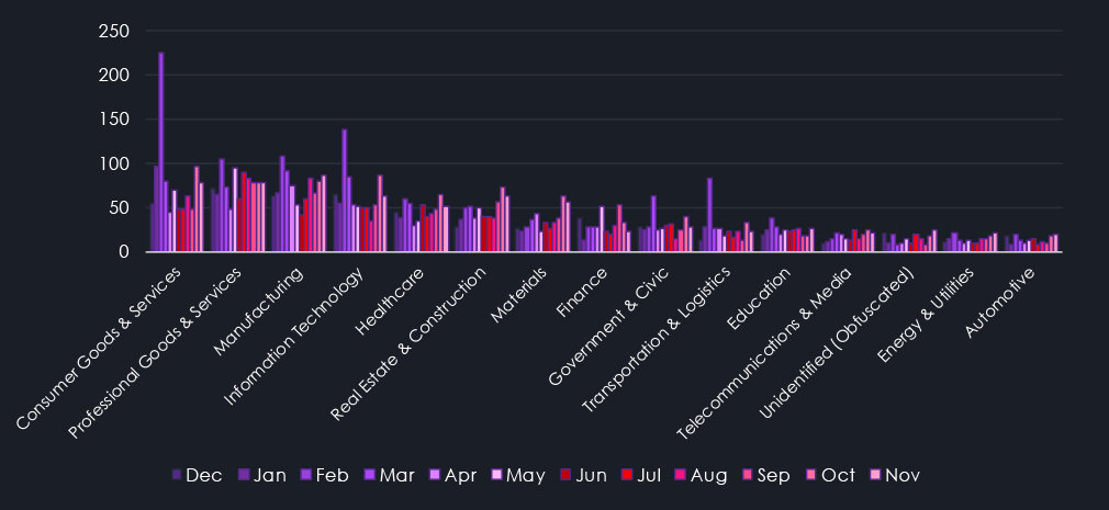Another major spike occurred during October and November. Clop came back again with a new exploit targeting IT, Manufacturing, and Retailers. However, volume was nowhere near the February rampage. Furthermore, Qilin also recorded a jump in activity targeting Manufacturing, Materials, Real Estate & Construction, Consumer, and Professional Goods & Services most prominently.