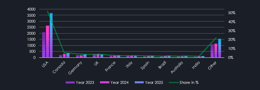 In total, 169 countries recorded ransomware victims since December 2022. Out of which 138 were also during 2025. The United States remains the most frequent victim of ransomware by a significant margin, accounting for 45.7%, 50.6%, and 51.8% of all victims throughout the years. Its dominance completely overshadows other countries in any visualization. Further in the chart above are other Top 10 countries, all recording an elevation in 2025. The remaining 159 countries accounted for 22% of all victims, underlying disproportionate targeting.