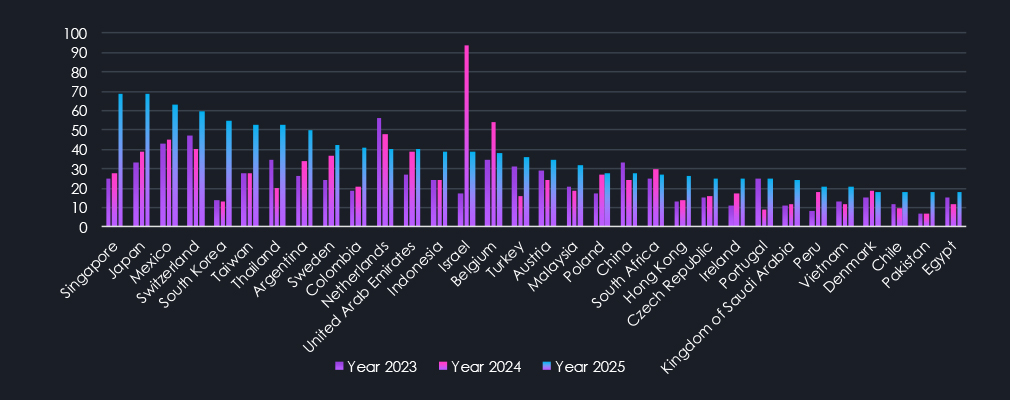 The charts above and below display 11th to 32nd and 33rd to 66th countries, sorted by the number of victims in 2025. Unfortunate runner-up in 11th place is Singapore, which went from 25 and 28 victims to 69 during 2025. Given the small size of the city-state, this is uniquely focused targeting. Most of the largest elevations are in Asian countries and Central & Latin America. Furthermore, a few Middle Eastern and Arab countries also recorded a significant increase in victims.