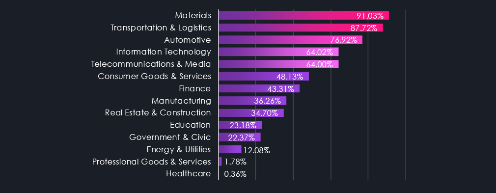 In 2025, the largest increases in attacks appeared in Automotive (+600%), Materials (+300%), and Real Estate & Construction (+200%). Transportation & Logistics (+167), Telecommunications & Media (+103%), and Professional Goods & Services (+67%) also recorded notable increases.