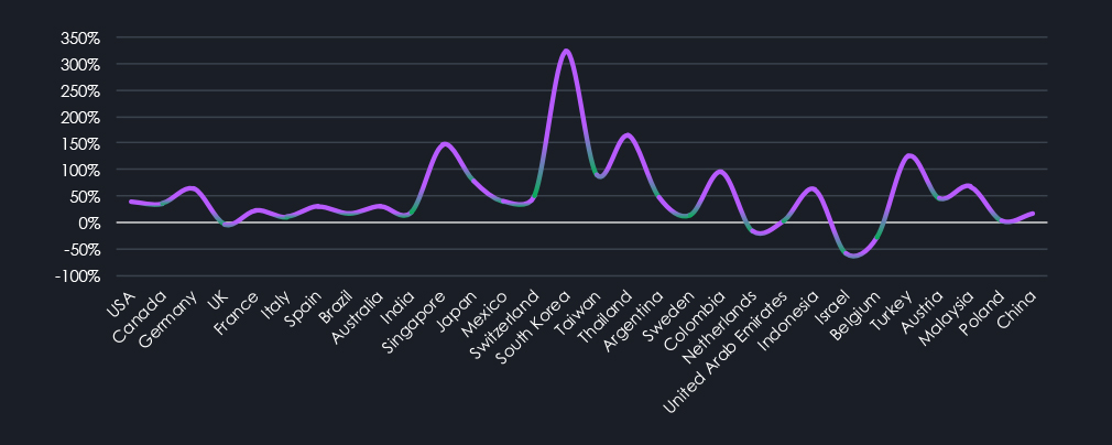 The number of countries with recorded ransomware victims grew from 125 to 138 year-over-year. Below are the top 35 and their respective annual changes. South Korea, Singapore, Thailand, Colombia, and Turkey recorded some of the highest elevations.