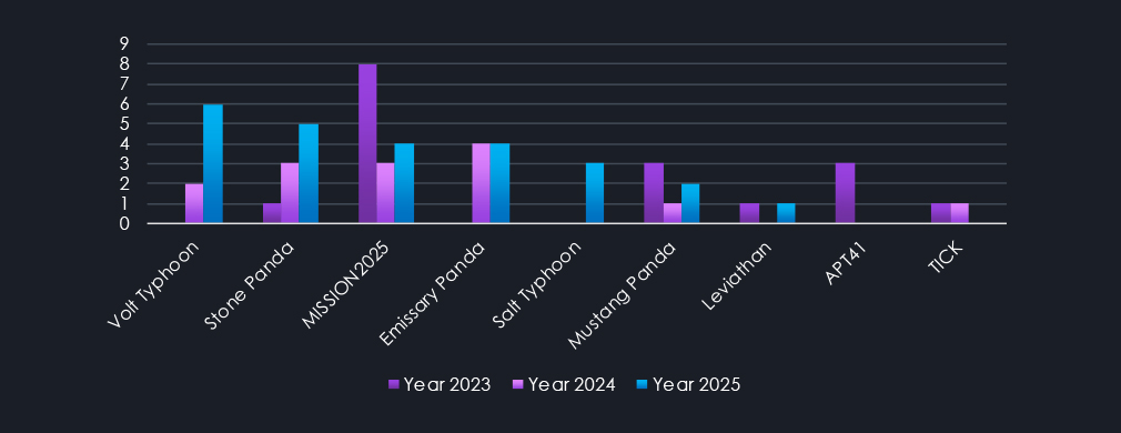 China-linked activity shows clear signs of reorganization rather than decline. Reduced visibility of groups such as APT41, MISSION2025 aka MISSION2074, TICK, and Mustang Panda was offset by sustained or growing activity from Emissary Panda, Leviathan, Volt Typhoon, Stone Panda, and Salt Typhoon. This pattern suggests structural changes within both PLA- and MSS-linked cyber units, with new tooling and attribution clusters replacing legacy group identities.