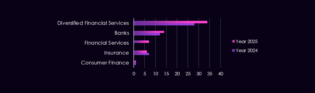 In total, 75 out of 124 gangs active in 2025 recorded victims in the finance industry, with 60% participation.