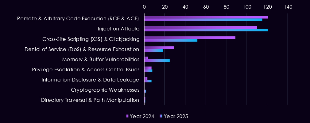 Reported CVEs affecting the energy and utilities sector show a continued emphasis on high-impact vulnerability classes, with 2025 maintaining steady discovery across multiple categories. Remote and arbitrary code execution (RCE/ACE) vulnerabilities remain the most prominent, appearing consistently throughout 2025 and illustrating their importance as direct paths to system compromise.