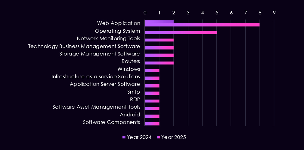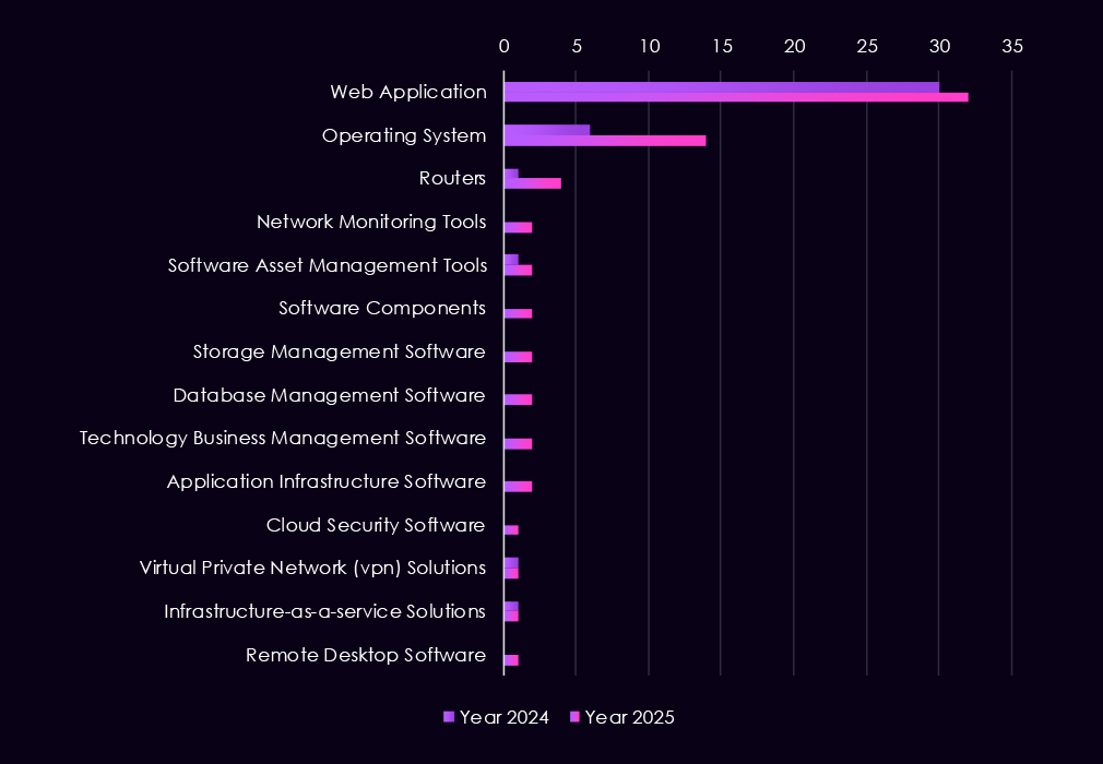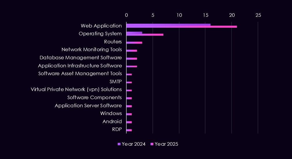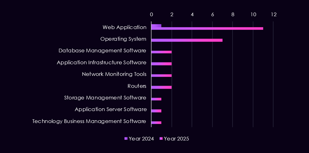 Compared to 2024, 2025 shows a broader range of technologies under attack. Threat activity expanded to include software management tools, application infrastructure, databases, network monitoring platforms, and cloud-related services, while VPNs and routers continue to see lower but steady attention.